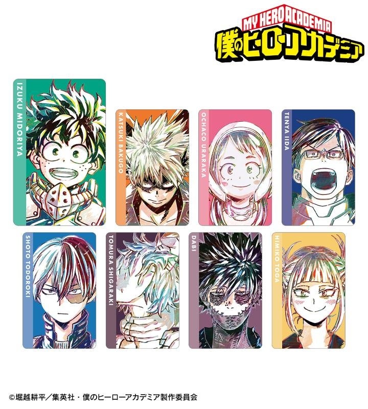 緑谷出久、爆豪勝己、麗日お茶子、飯田天哉、轟焦凍、死柄木弔、荼毘、トガヒミコのビジュアルを新たなタッチで魅力的に表現し、プラスチックカードに仕上げました。