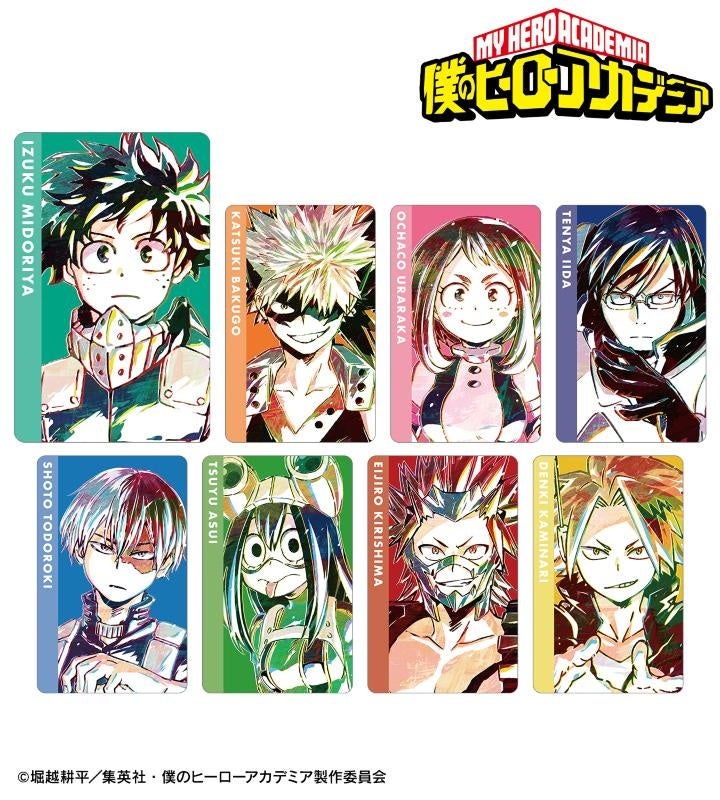 緑谷出久、爆豪勝己、麗日お茶子、飯田天哉、轟焦凍、蛙吹梅雨、切島鋭児郎、上鳴電気のビジュアルを新たなタッチで魅力的に表現し、プラスチックカードに仕上げました。