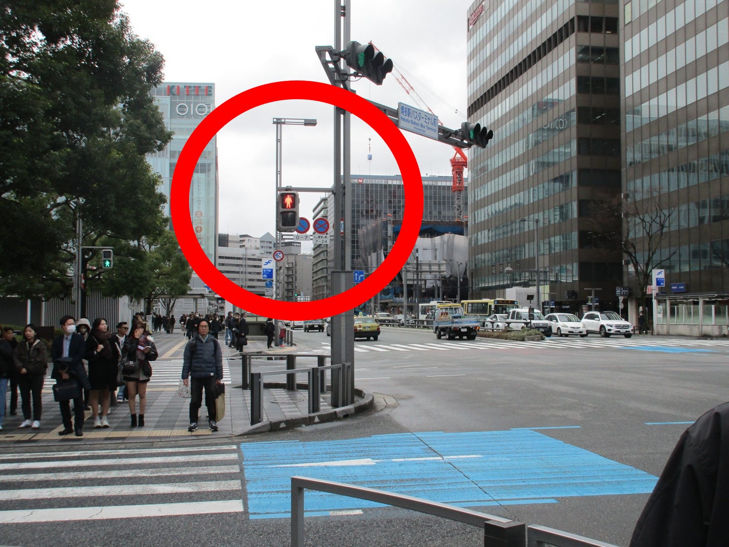 車両が交差点を通過し終えるまでに数秒を要す非常に広い交差点。そのため、車両がロータリー前の信号機を青信号で通過したとしても、横断歩道を横切る際には、赤信号だった横断歩道信号機が青信号に変わっている場合があり、歩行者にとって危険な交差点。