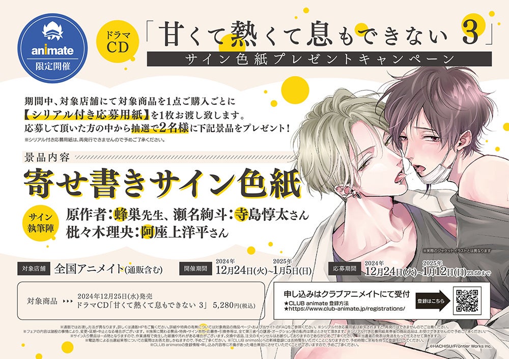 ドラマCD「甘くて熱くて息もできない 3」の発売を記念して、抽選プレゼント企画を実施いたします!