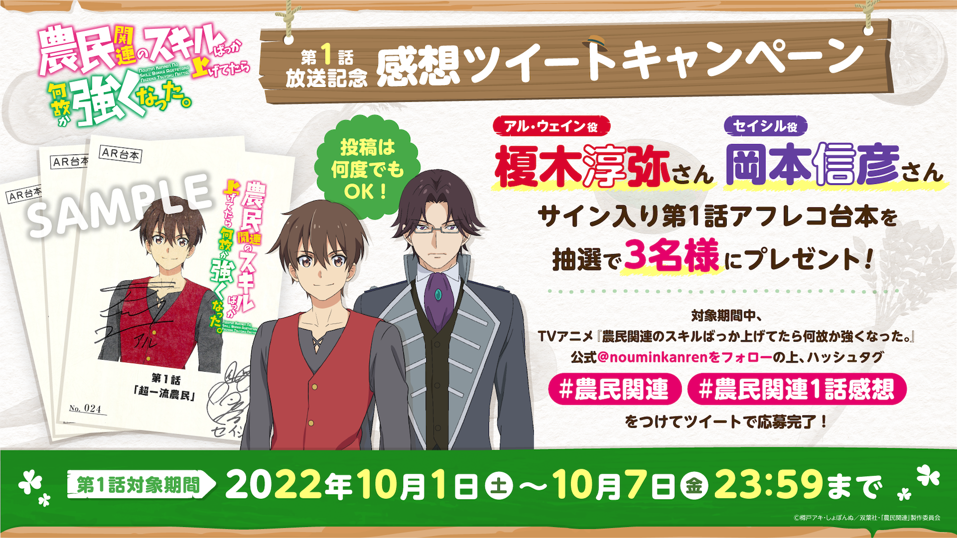 - TVアニメ『農民関連のスキルばっか上げてたら何故か強くなった。』 第1話放送記念 感想ツイートキャンペーン