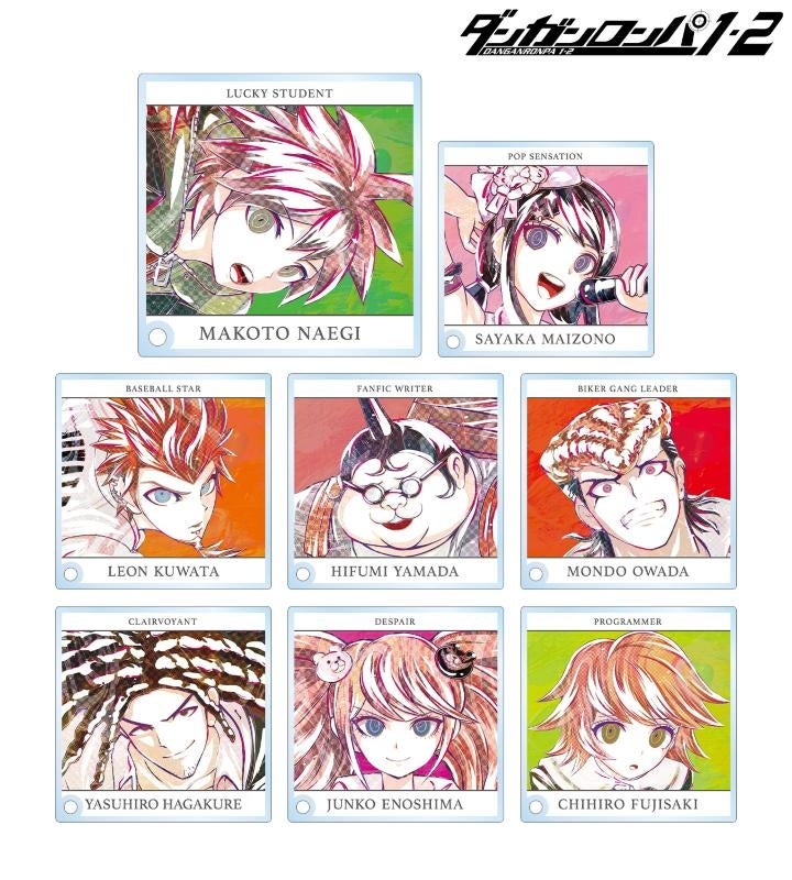 苗木誠、舞園さやか、桑田怜恩、山田一二三、大和田紋土、葉隠康比呂、江ノ島盾子、不二咲千尋のイラストを新たなタッチで魅力的に表現し、手のひらサイズのアクリルパネルに仕上げました。