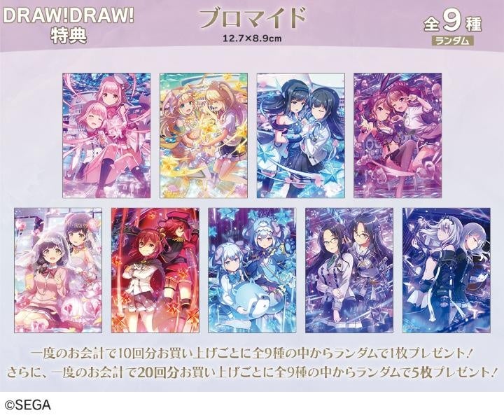 一度のお会計で10回分ご購入ごとに特典ブロマイド(全9種)の中からランダムで1枚、20回分ご購入ごとにランダムで5枚プレゼント!