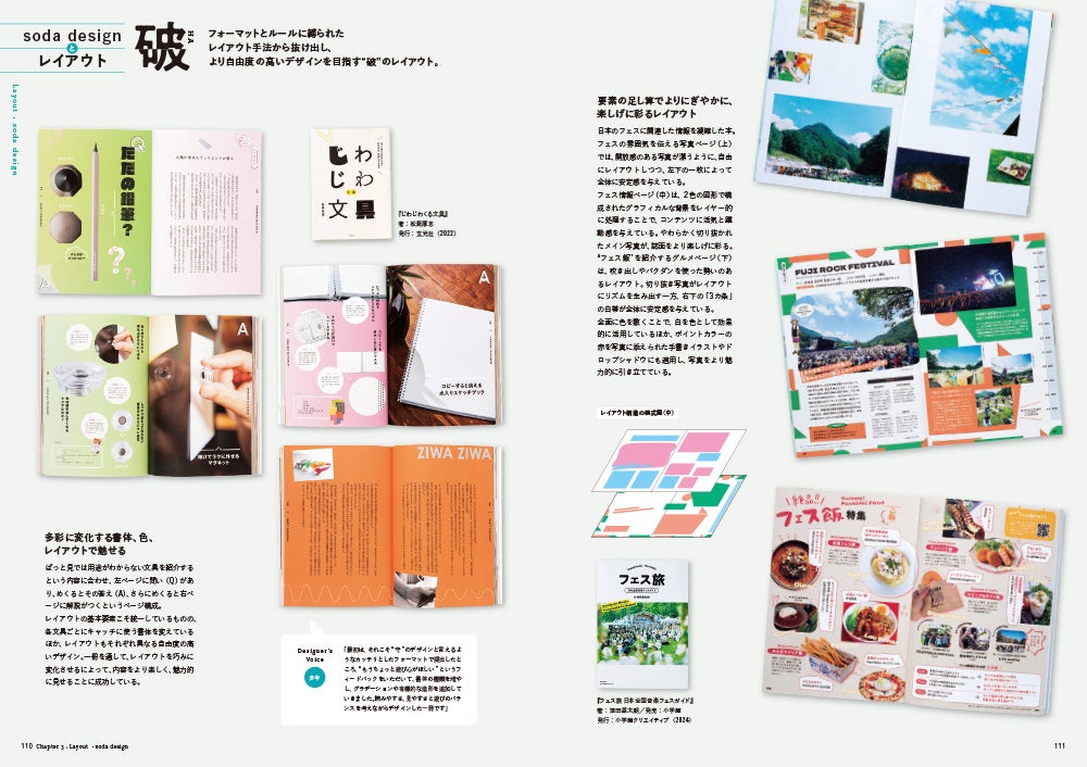 本書は「文字」「レイアウト」「色」という3つのテーマについて、ルール・セオリーを活かしたデザインから、ロジックでは説明が難しいデザインまで、“守破離”という3つのフェーズで解説、分析した解説書です。佐藤亜沙美さん、ナルティスさん、松田行正さん、soda designさん、中野豪雄さん、カイシトモヤさんという第一線で活躍するデザイナーの仕事を通して、ルール・セオリーの実践法、応用法を解き明かします。