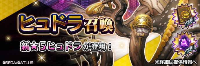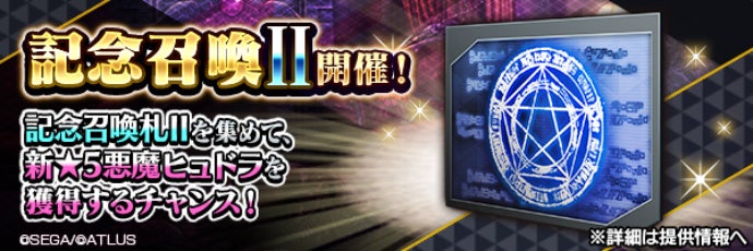 同日より開催の、“真・女神転生Ⅴ発売日記念ログインボーナス 第2弾”や、悪魔連合襲来イベント“怪物の母から生まれし九頭の毒蛇”のミッション達成報酬などでもらえる「記念召喚札Ⅱ」で挑戦可能な、新★5悪魔「邪龍 ヒュドラ」がラインナップされた記念召喚Ⅱが期間限定で登場します。