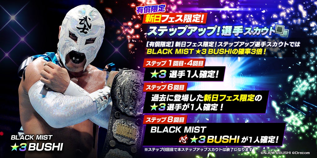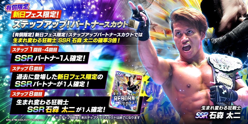 ブシモ『新日本プロレスSTRONG SPIRITS』フェス限定となる新SSRパートナー石森選手や新★3BUSHI選手が初登場する各フェス限定ステップアップスカウトを開始!
