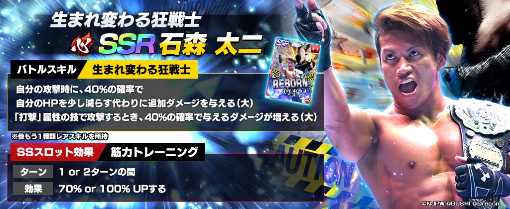 株式会社ブシロード(本社:東京都中野区、代表取締役社長:木谷高明)は、株式会社ドリコム (本社:東京都品川区、代表取締役社長:内藤 裕紀)と共同開発しているスマートフォンゲームアプリ『新日本プロレスSTRONG SPIRITS』(以下、新日SS)にて、全プレイヤーに1,500ダイヤ配布とフェス限定の新SSRパートナー「[生まれ変わる狂戦士]石森太二」や新★3選手「[BLACK MIST]BUSHI」が初登場する各フェス限定ステップアップスカウトを2022年9月30日(金)9:00から開始した事をお知らせいたします。