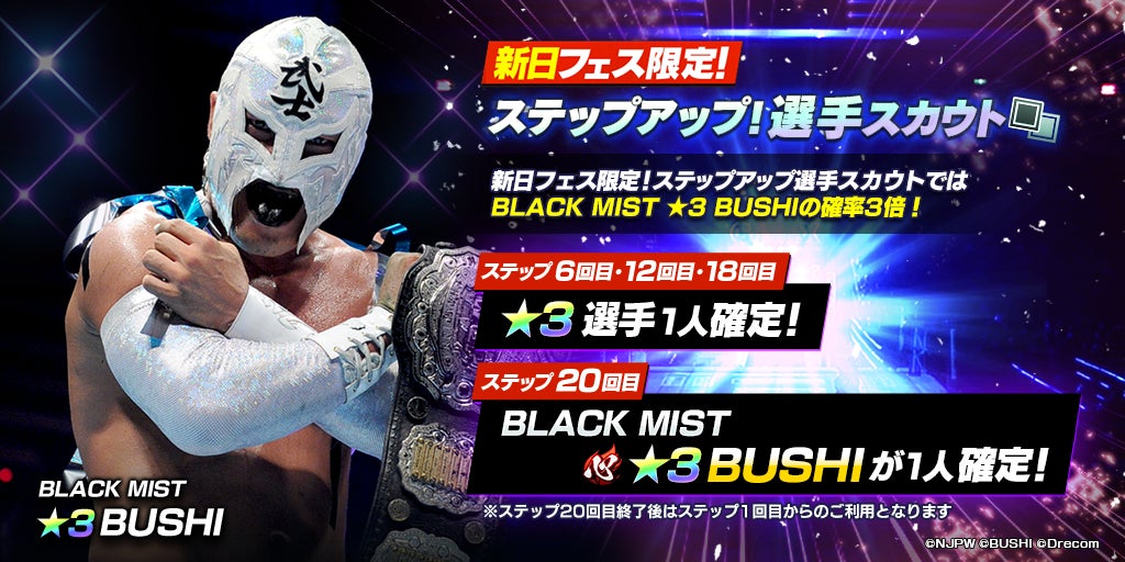 さらに初登場のフェス限定新★3選手「[BLACK MIST]BUSHI」がピックアップ対象選手として、ステップアップ回数に関わらずスカウト確率が通常の3倍かつ獲得時のピース量が増量となっております。