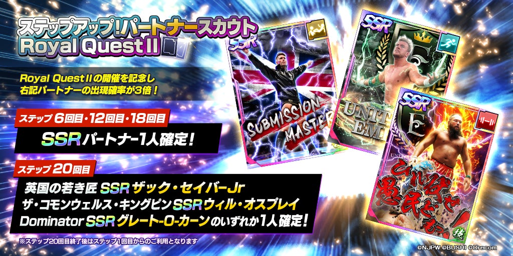 - 10.1と10.2でロンドン開催される新日本プロレス大会「Royal Quest Ⅱ」を記念して、全プレイヤーに1,500ダイヤプレゼントと期間限定の各ステップアップスカウトの開催が決定!