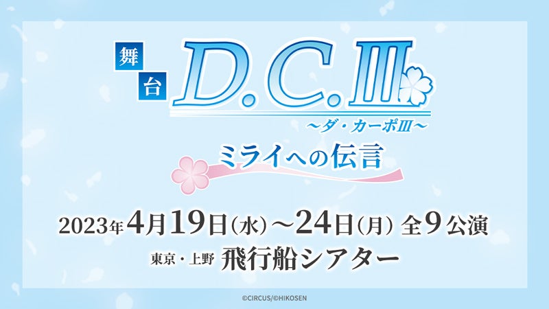 株式会社ブシロード(本社:東京都中野区、代表取締役社長:木谷高明)のグループ会社である株式会社劇団飛行船(本社:東京都中野区、代表取締役社長:小原正司)が、2023年4月に『舞台「D.C.Ⅲ~ダ・カーポⅢ~」』の新作上演に伴い、公演概要を発表したことをお知らせします。