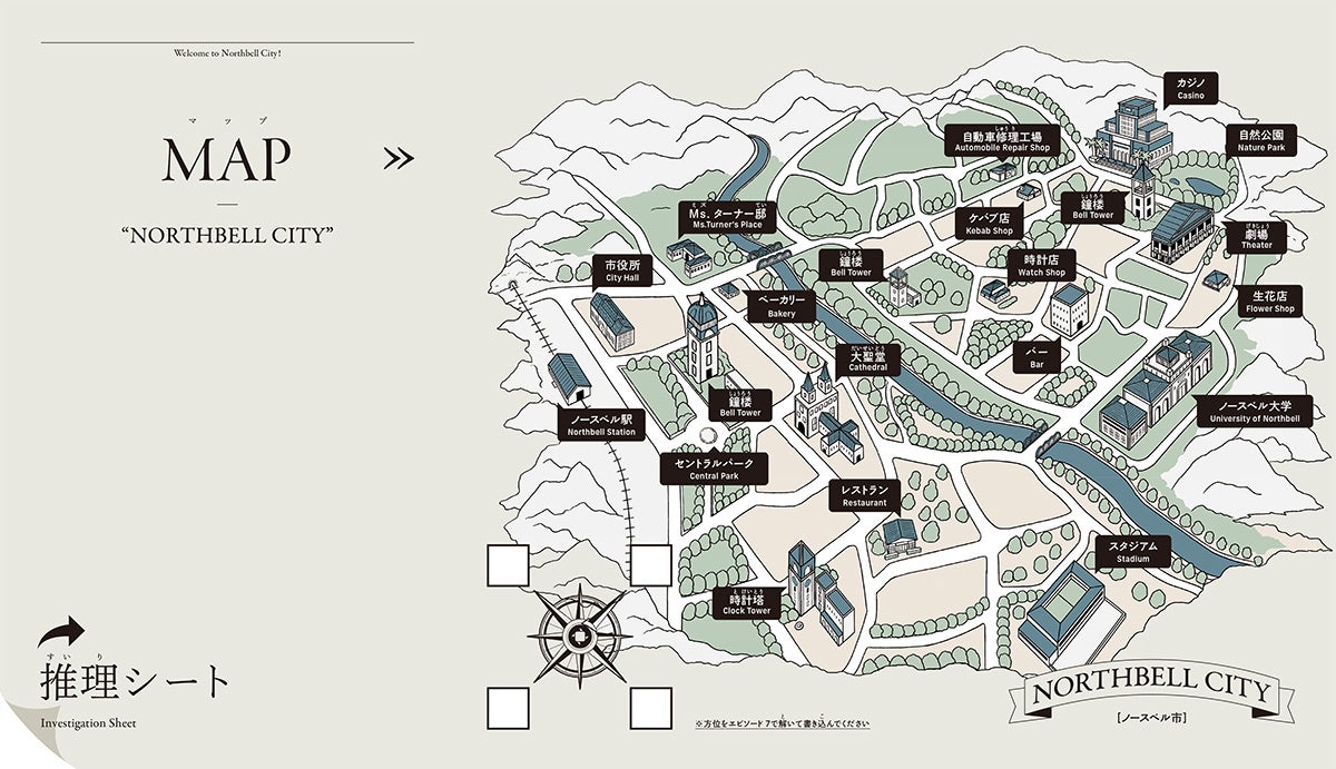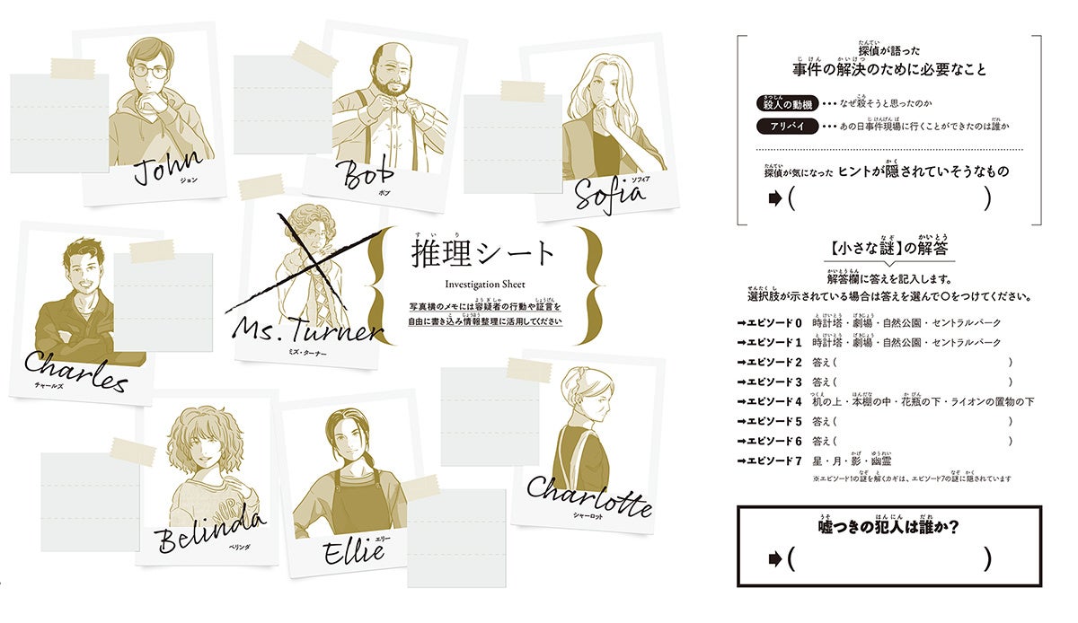 さらに巻末には折りたたみ式の【MAP】と【推理シート】がついている。広げて点線で切り取れば、推理に役立つアイテムとなる。【MAP】は容疑者の行動や事件現場を特定するヒントになり、【推理シート】は容疑者が一覧できる。そこには【小さな謎】の答えを書き込めるほか、事実や証言が整理でき、犯人が推理しやすくなるだろう。