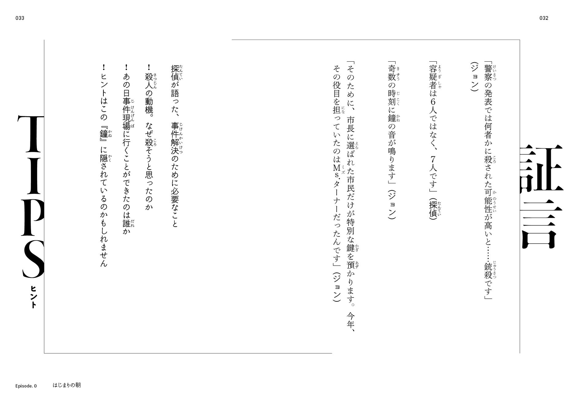 【証言】には容疑者が語った注目すべき言葉たちが書かれているが、その中に犯人の噓がたった一つだけ隠れている。あなたはそれを見つけなければならない。一方【TIPS】にはエピソードの中で注目すべき事実が書かれている。犯人の動機や行動のヒントになることがあるので見逃さないようにしたい。