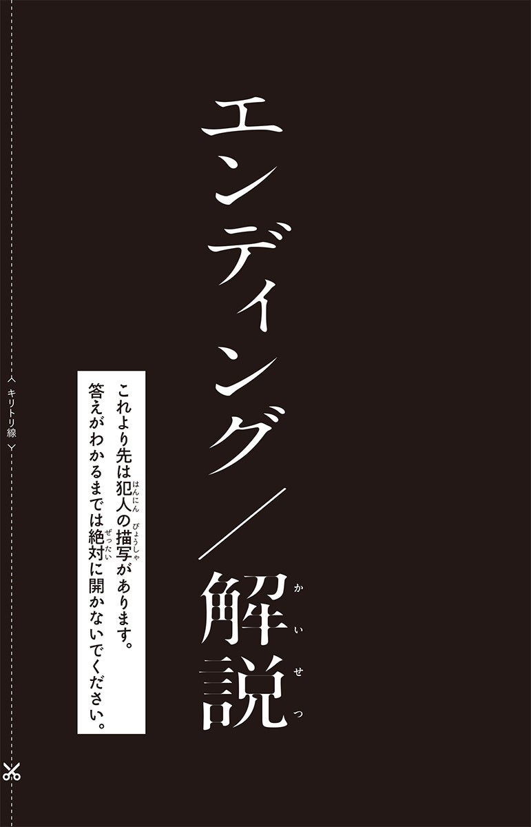 すべてのエピソードが読み終わったら、いよいよ推理の時間だ。「容疑者Aはこの時間、ここにいたから犯行は不可能」「容疑者Bはこれを利用すれば犯行が可能」……など、エピソードの内容を整理して、犯人を予想しよう。真実は袋とじの中に隠されていて、外からは見えないようになっている。答えがわかるまでは決して開けてはならない。