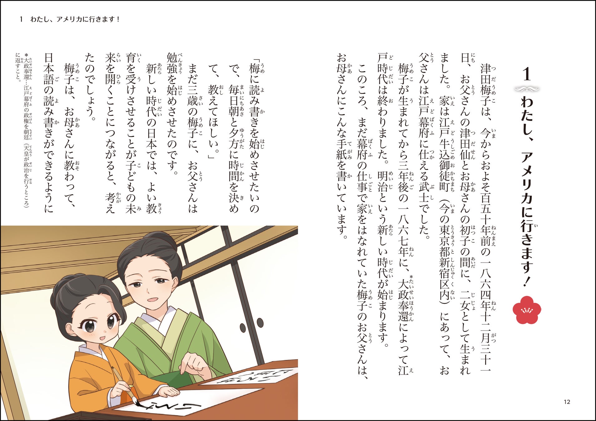 巻頭に図解ページ付き。津田梅子や、お話に登場する人物の紹介、津田梅子が活躍した場所やその当時の様子、子ども時代から晩年までの流れが一目でわかります。お話を読む前にイメージがわきやすくなります。
