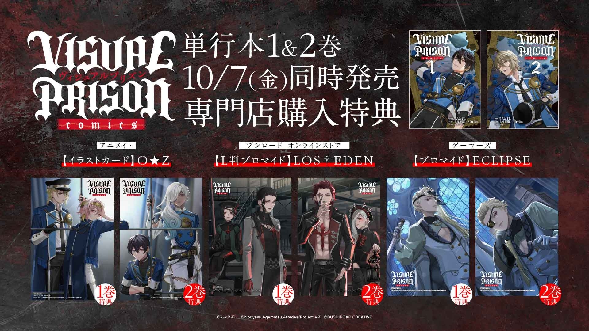 株式会社ブシロード(本社:東京都中野区、代表取締役社⻑:木谷高明、以下ブシロード)のグループ会社にあたる株式会社ブシロードクリエイティブ(本社:東京都中野区、代表取締役社長:成田耕祐)は、無料で読めるWEBマンガサイト「コミックブシロードWEB」にて好評連載中の『VISUAL PRISON comics』単行本1巻と2巻が、本日10月7日(金)に同時発売することをご案内致します。