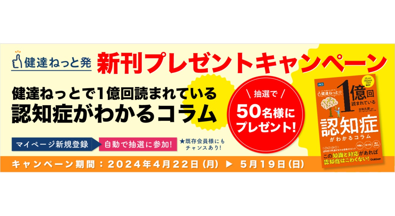 株式会社学研ホールディングス(東京・品川/代表取締役社長:宮原博昭)のグループ会社、メディカル・ケア・サービス株式会社(埼玉・さいたま市/代表取締役社長:山本教雄)は、家族の介護と健康を支える学研の情報サイト「健達ねっと」にて2024年4月22日(月)より「新刊プレゼントキャンペーン」を開始いたしました。