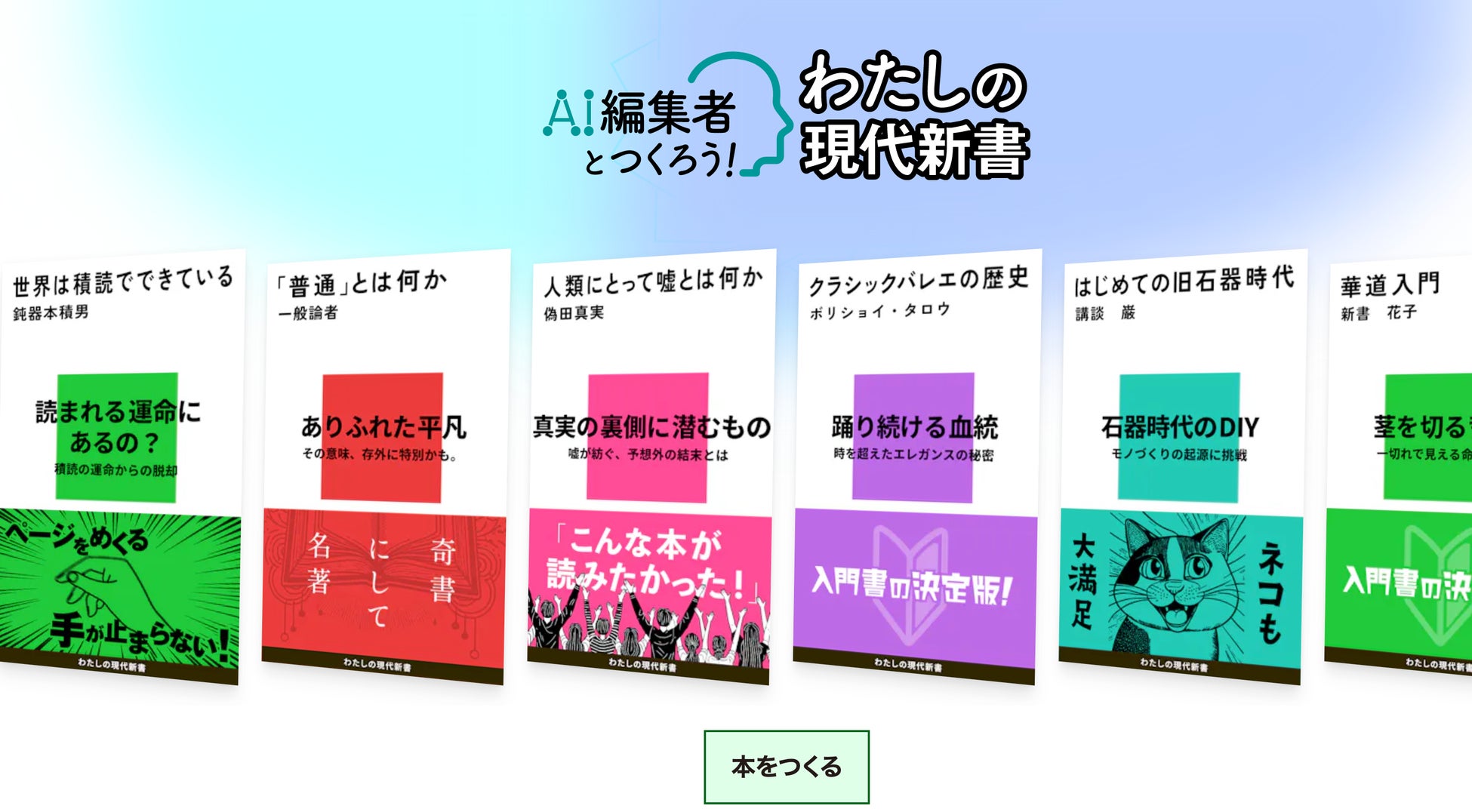 AI編集者と一緒に、現代新書の特徴であるカラフルなスクエアが入った書影をつくることができるサービスです。