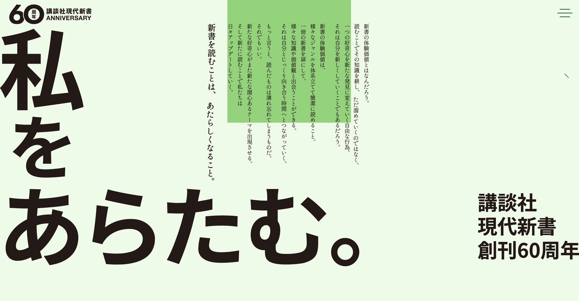 現代新書の歴史など詳細については、60周年記念冊子「新書へのとびら」をご覧いただけますと幸いです(特設サイトからダウンロードすることができます)。