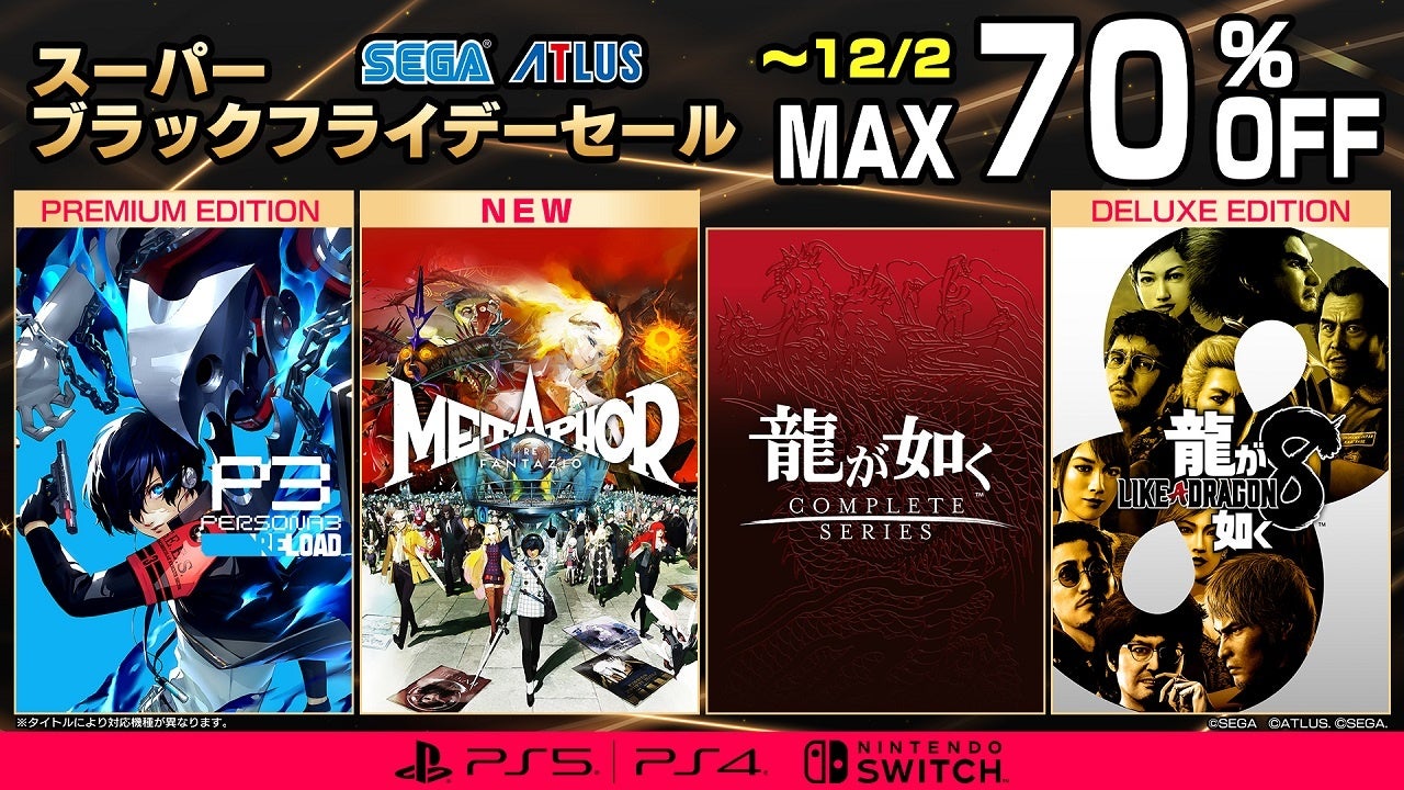 株式会社セガは、PlayStation™Storeおよびニンテンドーeショップにて販売中の一部PlayStation®5/PlayStation®4/Nintendo Switch™用タイトルを対象とし、期間限定で特別価格にて販売する「ブラックフライデーセール」を開催中です。
