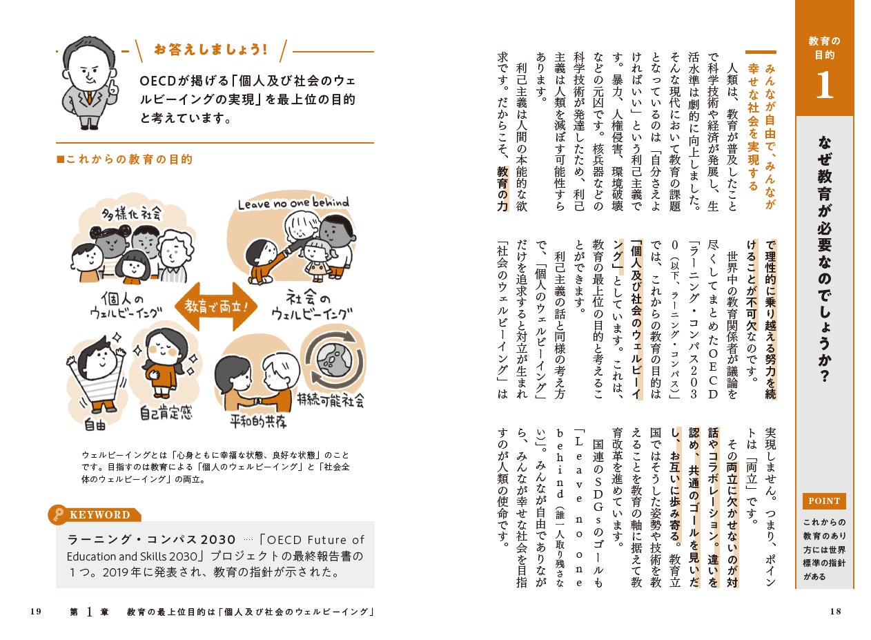 教育は「家庭」、「学校」、「社会」とさまざまな場所で行われるものです。手段は違えども、同じ方向に向かって教育を行う必要があります。その教育が目指すべき「いちばん大切な目的」(=最上位目的)は、子どもたちが幸福で、肉体的、精神的、社会的に満たされた状態にあること、つまり「子どものウェルビーイング」であると工藤先生は考えています。みなさんの疑問に答えながら、「子どものウェルビーイング」を実現するために必要な考え方や実践すべき事柄を、イラストもまじえてコンパクトにまとめたのが本書です。