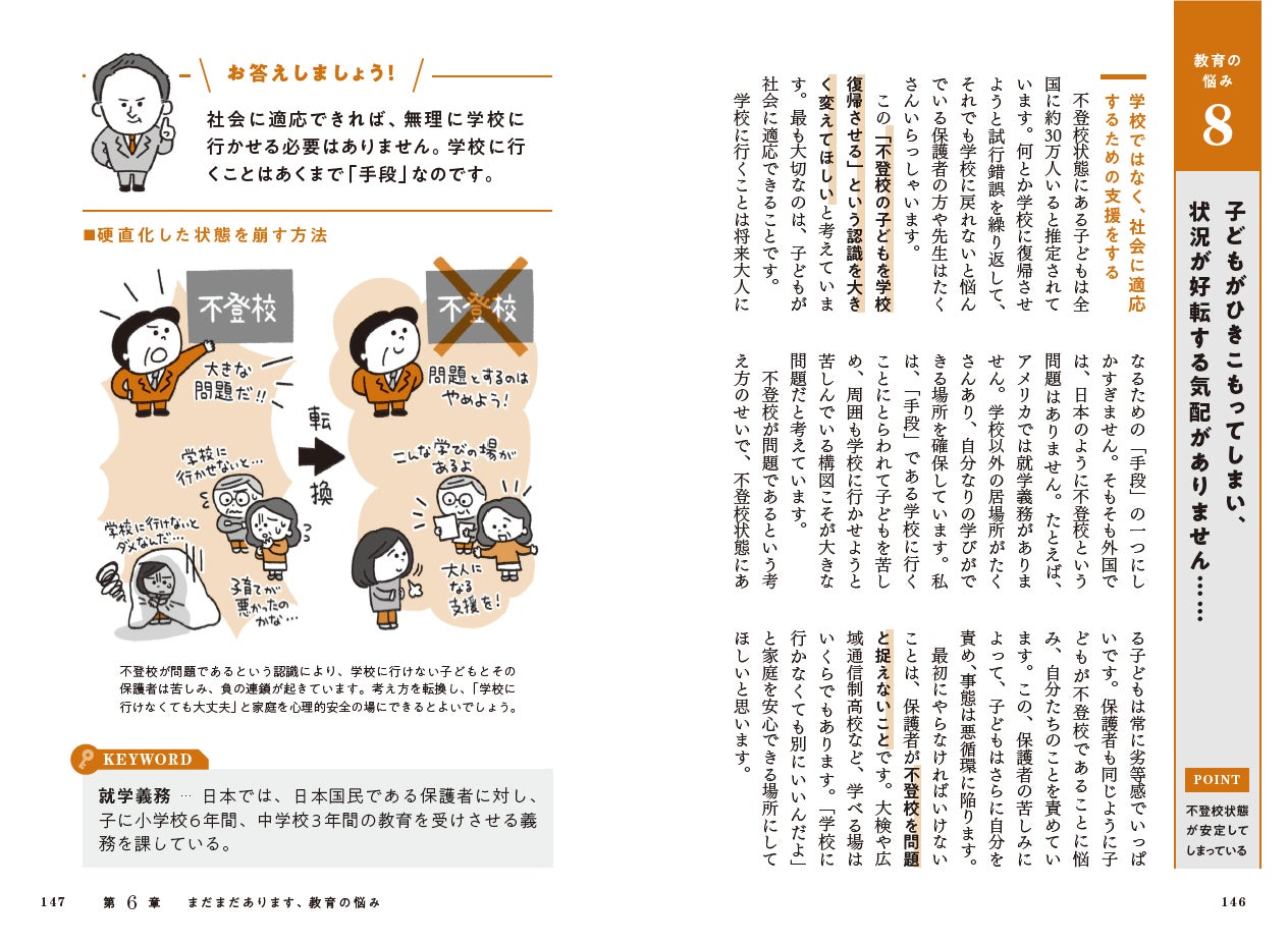 不登校問題、障がいや特性のある子どもへの教育、個別最適な学び、校則など、近年話題となっている最新のトピックもイラストでわかりやすくお伝えします。