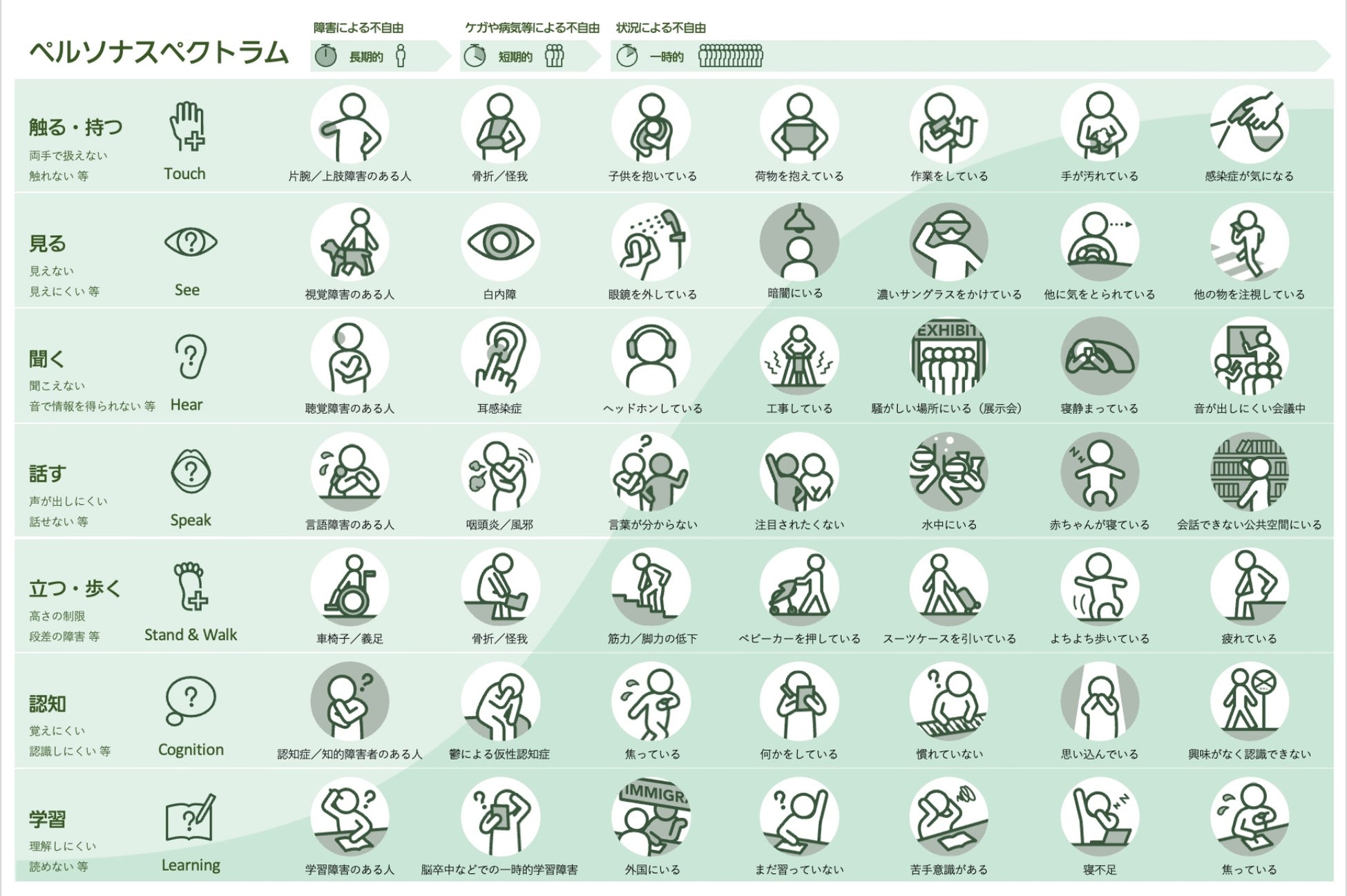 そのうちの一つ、ペルソナスペクトラムツールは5つの行動指針の一つ目である「Overarching・全体にかかる考え方」の「ひとりのためのアイデアから、すべてのひとの生きやすさの実現を目指す」の理解を深め、共通認識を持ちやすくするためのツールです。多様な人たちをイメージしやすいように特性を可視化し、図にまとめました。