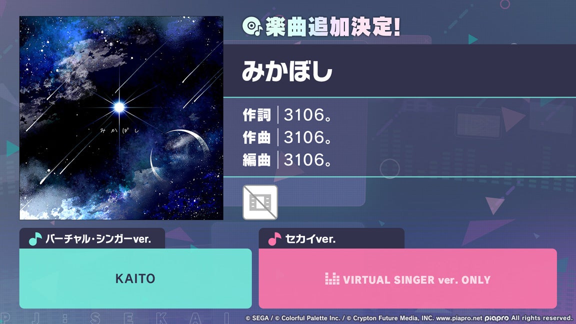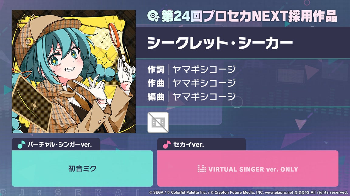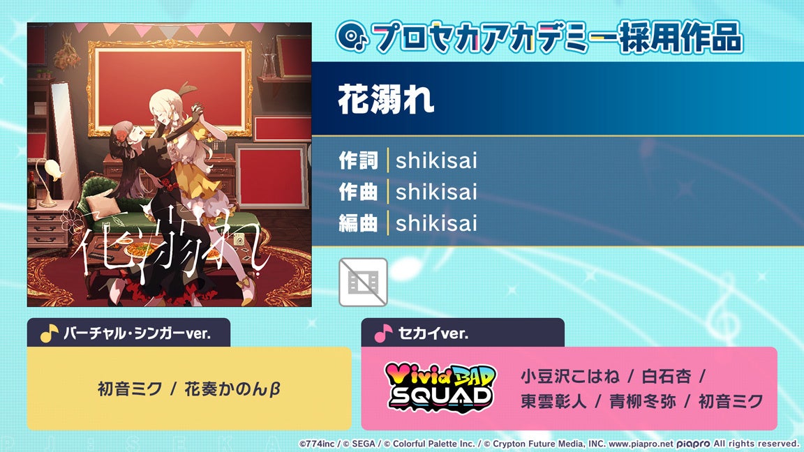 新たなリズムゲーム楽曲として、以下3曲の追加が決定いたしました。「シークレット・シーカー」(作詞・作曲:ヤマギシコージ)は、「一緒に作ろう!第24回楽曲コンテストプロセカNEXT」の採用作品、「花溺れ」(作詞・作曲:shikisai)は、ボカロクリエイター育成プロジェクト「プロセカアカデミー」で、生徒が制作した楽曲の中で最も票を獲得した楽曲となります。