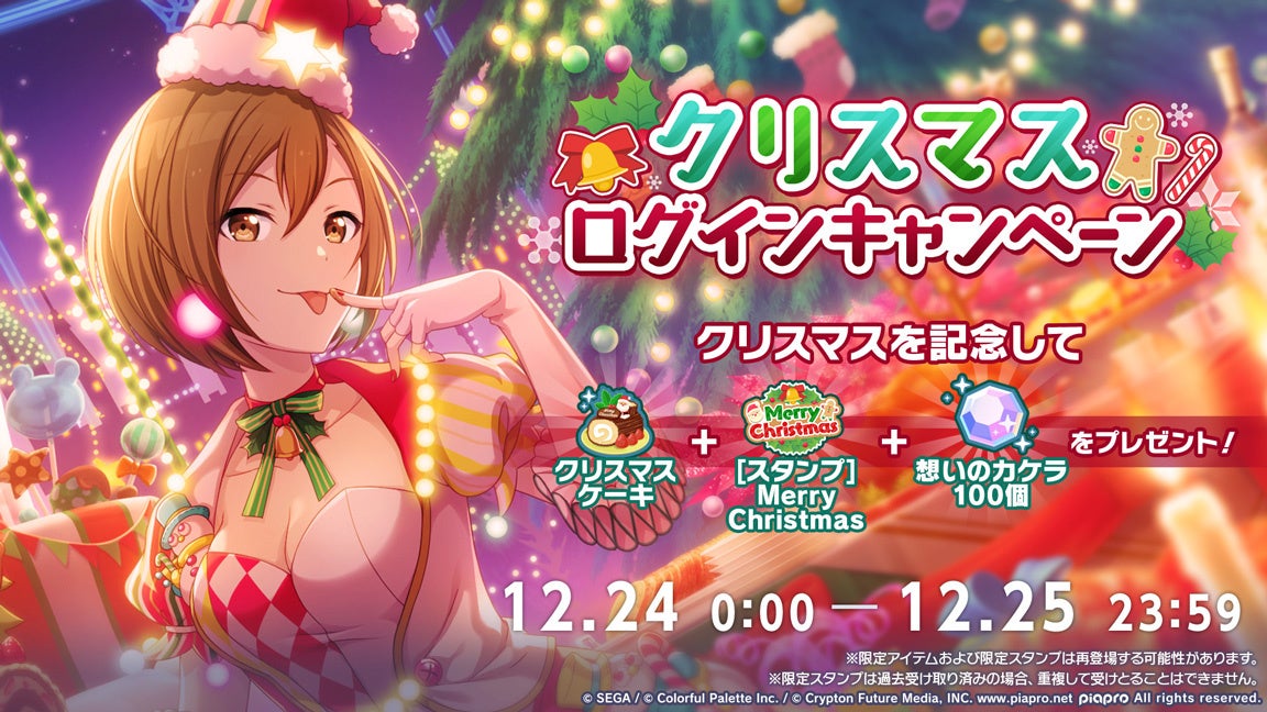 キャンペーン期間中にログインした方には、「想いのカケラ」×100個と「クリスマスケーキ」をプレゼントいたします。また、「[スタンプ]Merry Christmas」を一度も受け取ったことがない方は、本キャンペーンで入手することができます。