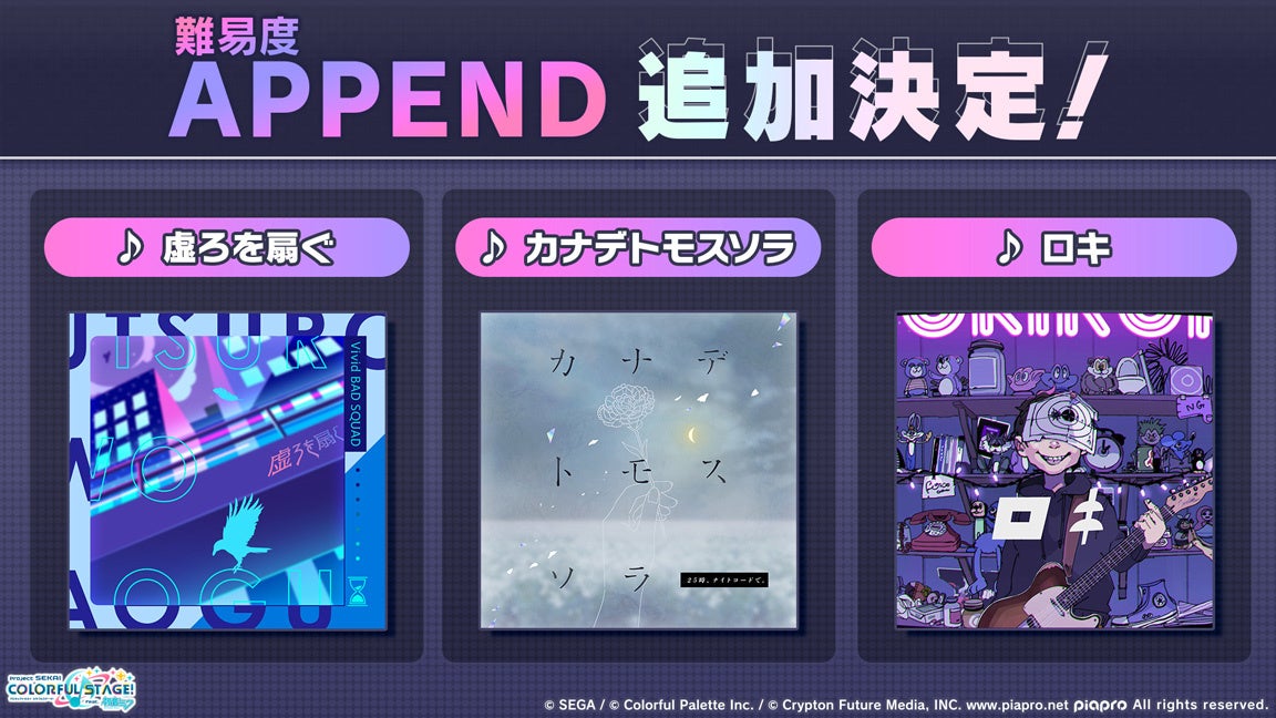 「虚ろを扇ぐ」(作詞・作曲:獅子志司)、「カナデトモスソラ」(作詞・作曲:Sasanomaly)、「ロキ」(作詞・作曲:みきとP)に、難易度「APPEND」の譜面が追加されることが決定いたしました。今後の続報をお楽しみに!