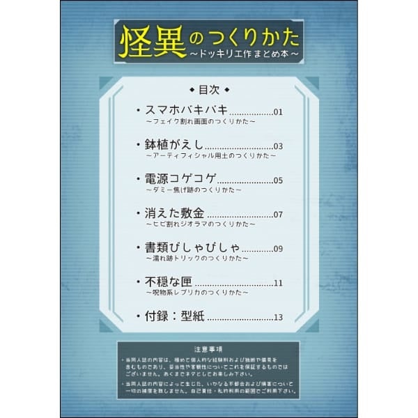 「怪異のつくりかた 〜ドッキリ工作まとめ本〜」は、日常の素材を活用しながら、仕掛け人も驚くような工作アイデアを豊富に紹介する同人誌です。