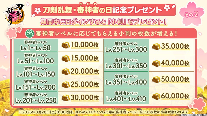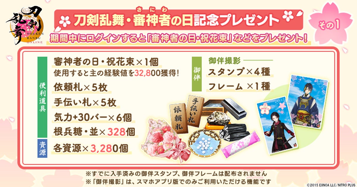 期間中、ゲームにログインした全ユーザーを対象に、便利道具「審神者の日・祝花束」や審神者レベルに応じた小判を贈る「刀剣乱舞・審神者の日記念ログインプレゼント」を実施いたします。
