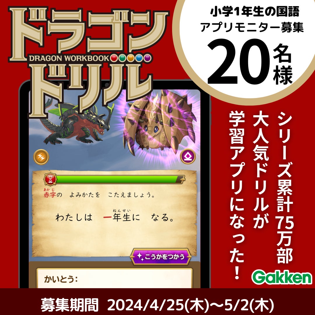 株式会社 学研ホールディングス(東京・品川/代表取締役社長:宮原博昭)のグループ会社、株式会社 Gakken(東京・品川/代表取締役社長:五郎丸徹)が運営する、小学1~4年生向けの算数と国語が学べる学習アプリ『小学生の算数・国語! 学研ドラゴンドリル 大人気ドリルで学ぶ』(iOS/Android版)の公開開始にあわせ、2024年4月25日(木)より、『ドラゴンドリルアプリ』小1国語のモニター20名を募集いたします。モニター応募締め切りは、5月2日(木)です。