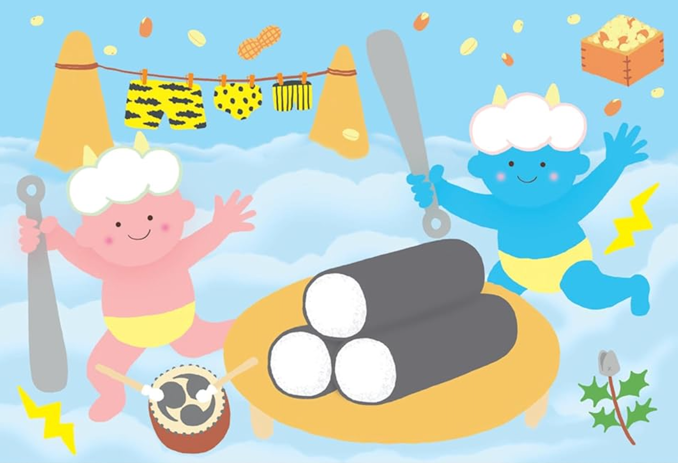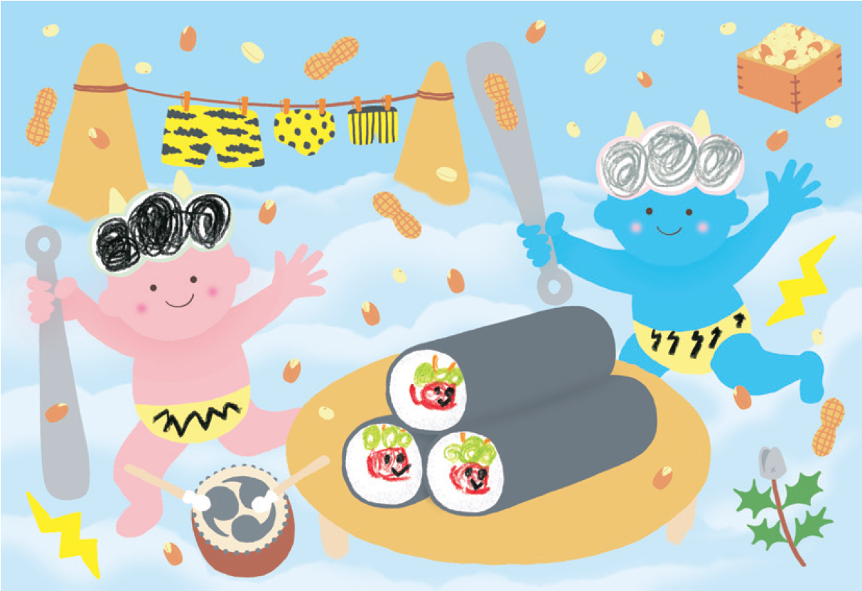2月は恵方巻きの具を好きなように描いて、鬼の頭は色を塗り、付録の豆まきシールを貼ります。