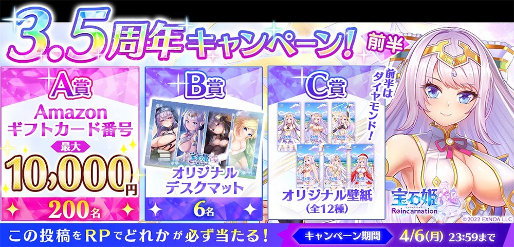 『宝石姫 Reincarnation』3.5周年を記念して、最大1万円分のAmazonギフトカード番号、オリジナルグッズ、オリジナル壁紙等が抽選で当たる?!ハズレなしの超豪華なRPキャンペーンを開催!