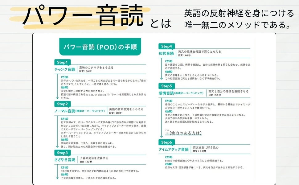 「パワー音読」は、ただ声を出して英語を読むだけではありません。6種類の音読メソッドを組み合わせて、思考、情緒、反射を短時間でリンクさせる。英語の反射神経を身につける唯一無二のメソッドです。