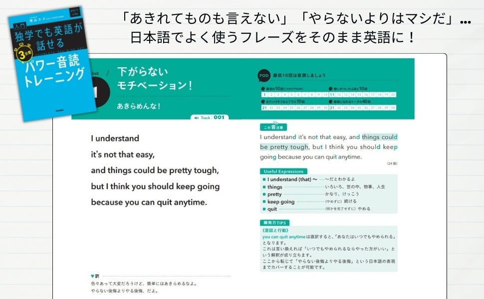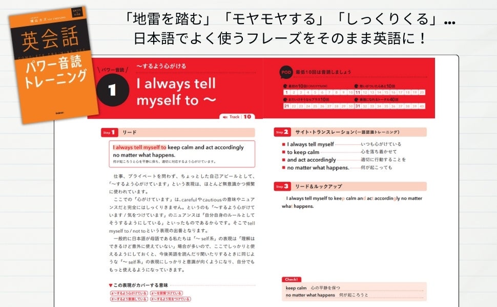 通常15分以上かかる1回の【パワー音読】を3分で完結するよう短く、より効率的に学習できるように書き下ろしました。英会話入門者でもトレーニングにチャレンジしやすく、日英変換力や発話スピードはもちろん、瞬時の英文理解力と発音も同時に鍛えることができます。