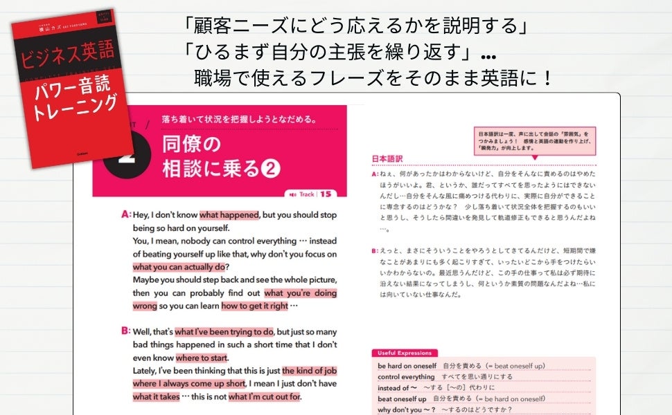 ・「顧客ニーズにどう応えるかを説明する」「ひるまず自分の主張を繰り返す」……など職場でよく接する状況に合ったフレーズをそのまま英語に!