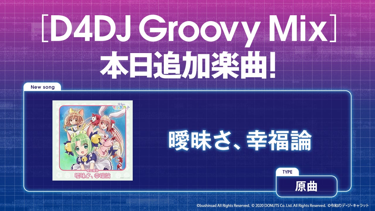 株式会社ブシロード(本社:東京都中野区、代表取締役社長:木谷高明)は、株式会社DONUTS(本社:東京都渋谷区、代表取締役:西村啓成)と共同開発のスマートフォン向けリズムゲーム「D4DJ Groovy Mix」(以下グルミク)にて、ミニアニメ「令和のデ・ジ・キャラット」とのコラボイベント「令和のグ・ル・ミックスにょ」を10月15日(土)12:00より開催いたしました。
