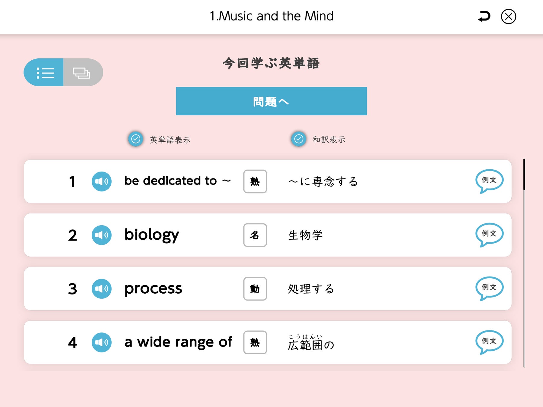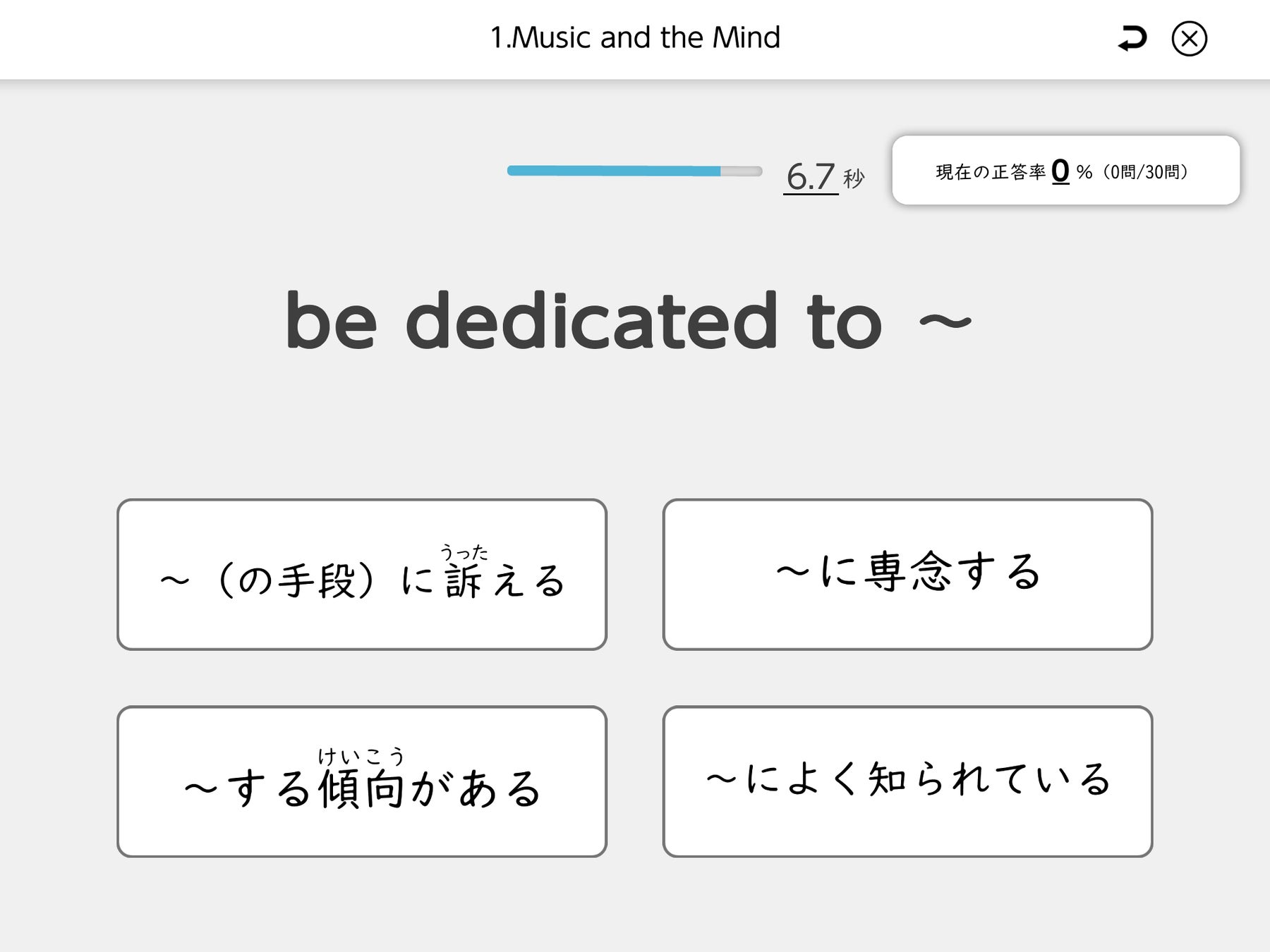 英単語テストを実施し、間違えた問題があれば、当たるまで自動的に再度出題されます。全問正解したら次に進みます。