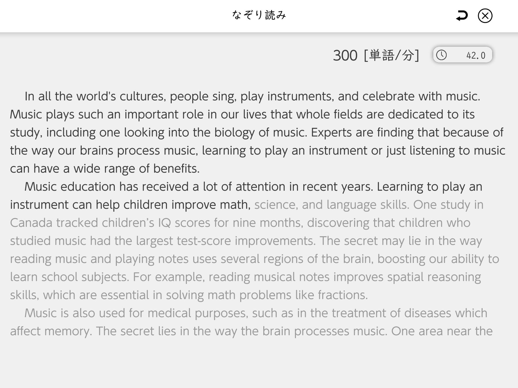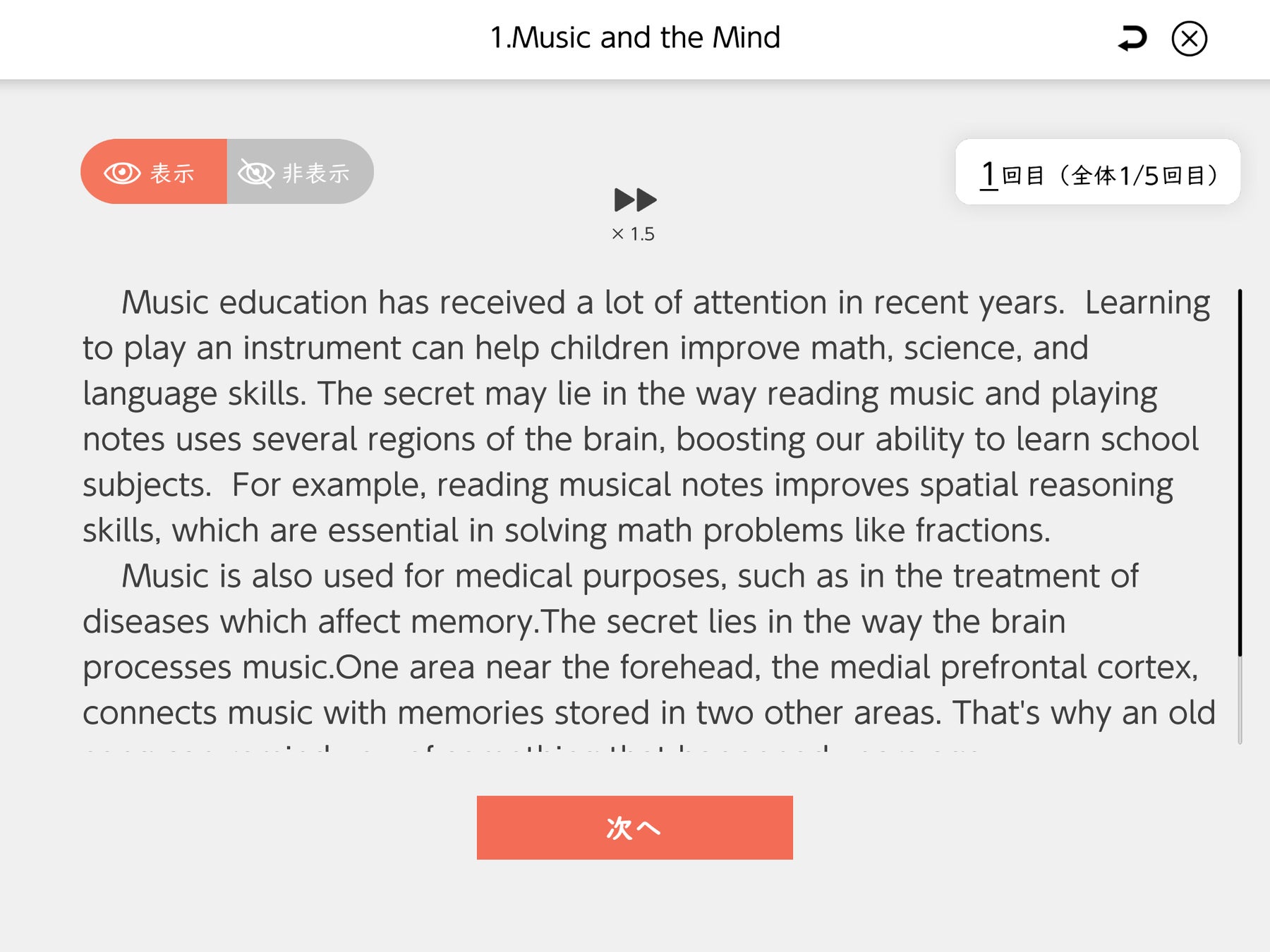 通常よりも速い音声にてリスニングを行います。耳が慣れてきて、通常の速さが遅く感じます。