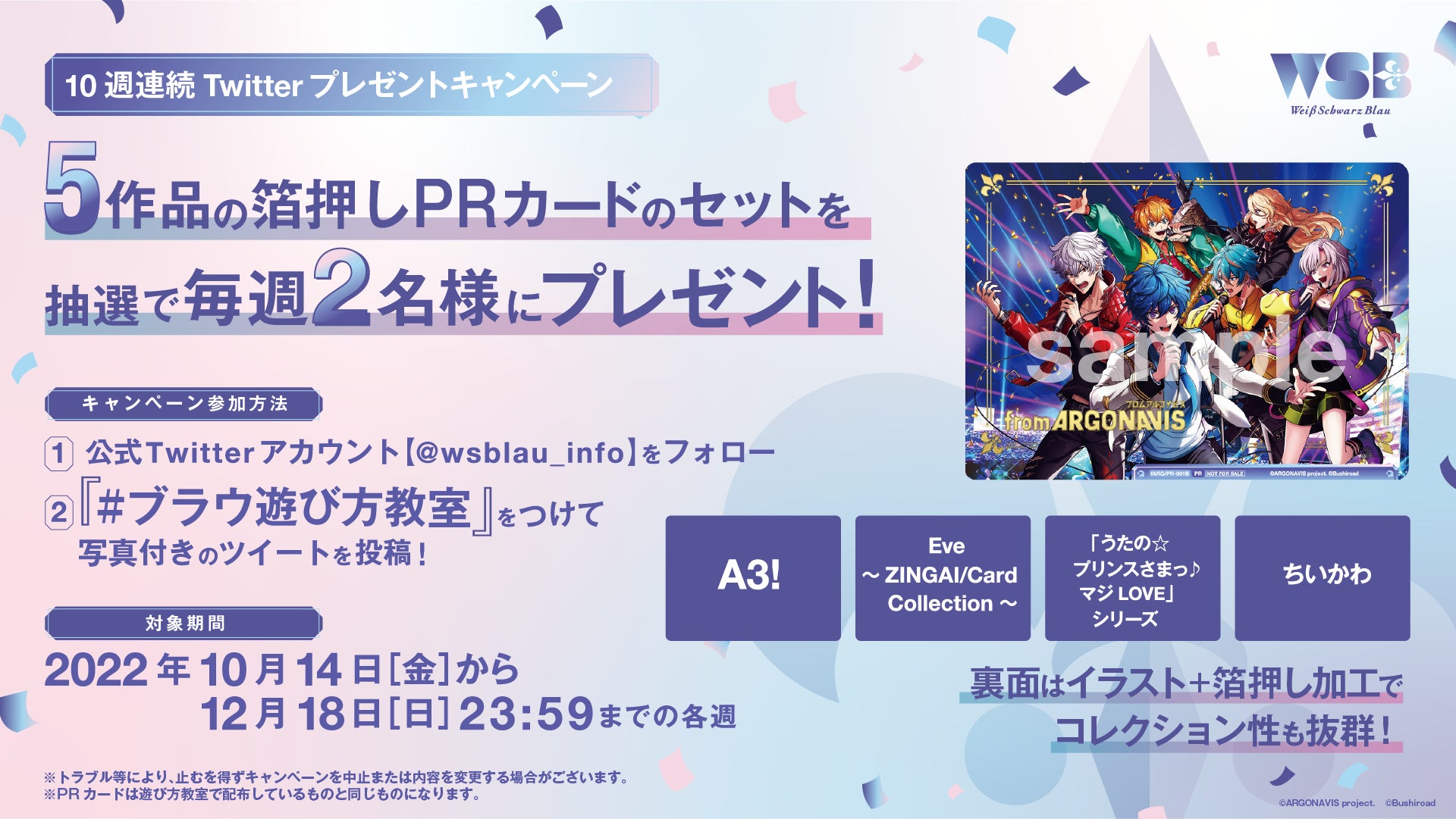 ヴァイスシュヴァルツブラウ公式Twitterアカウントをフォローし「#ブラウ遊び方教室」で写真付きツイートをすると、抽選で毎週2名様にブラウレア仕様の箔押しPRカード5枚セットをプレゼントさせていただきます。