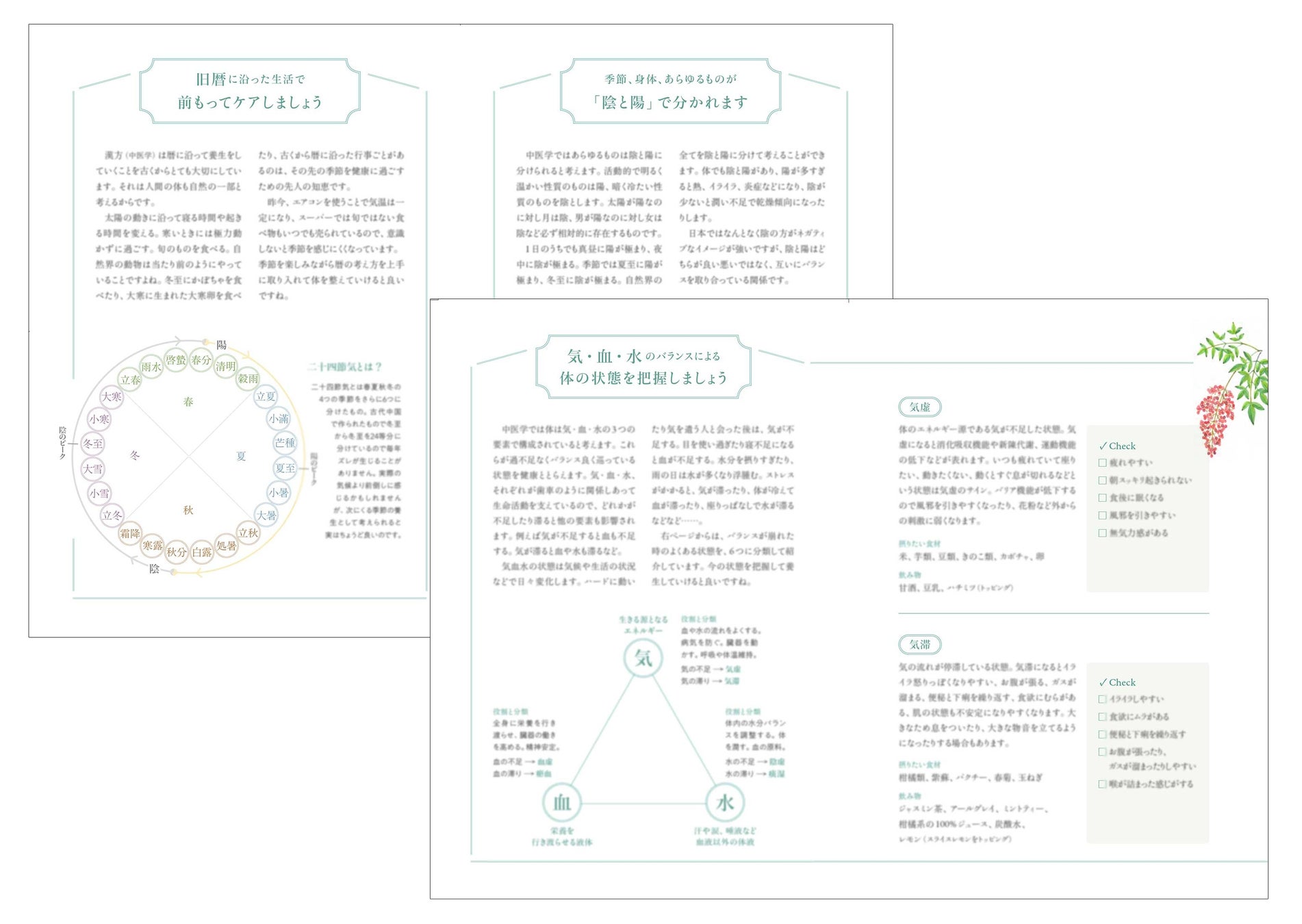 巻頭には、漢方にこれまでなじみがなかった人にも分かりやすい、入門記事を掲載。養生の基礎知識や漢方と暦の関係、体質別の不調に合わせた食材一覧など、まずは知っておきたい知識を紹介しています。手帳の使い始めに読むのがおすすめ。