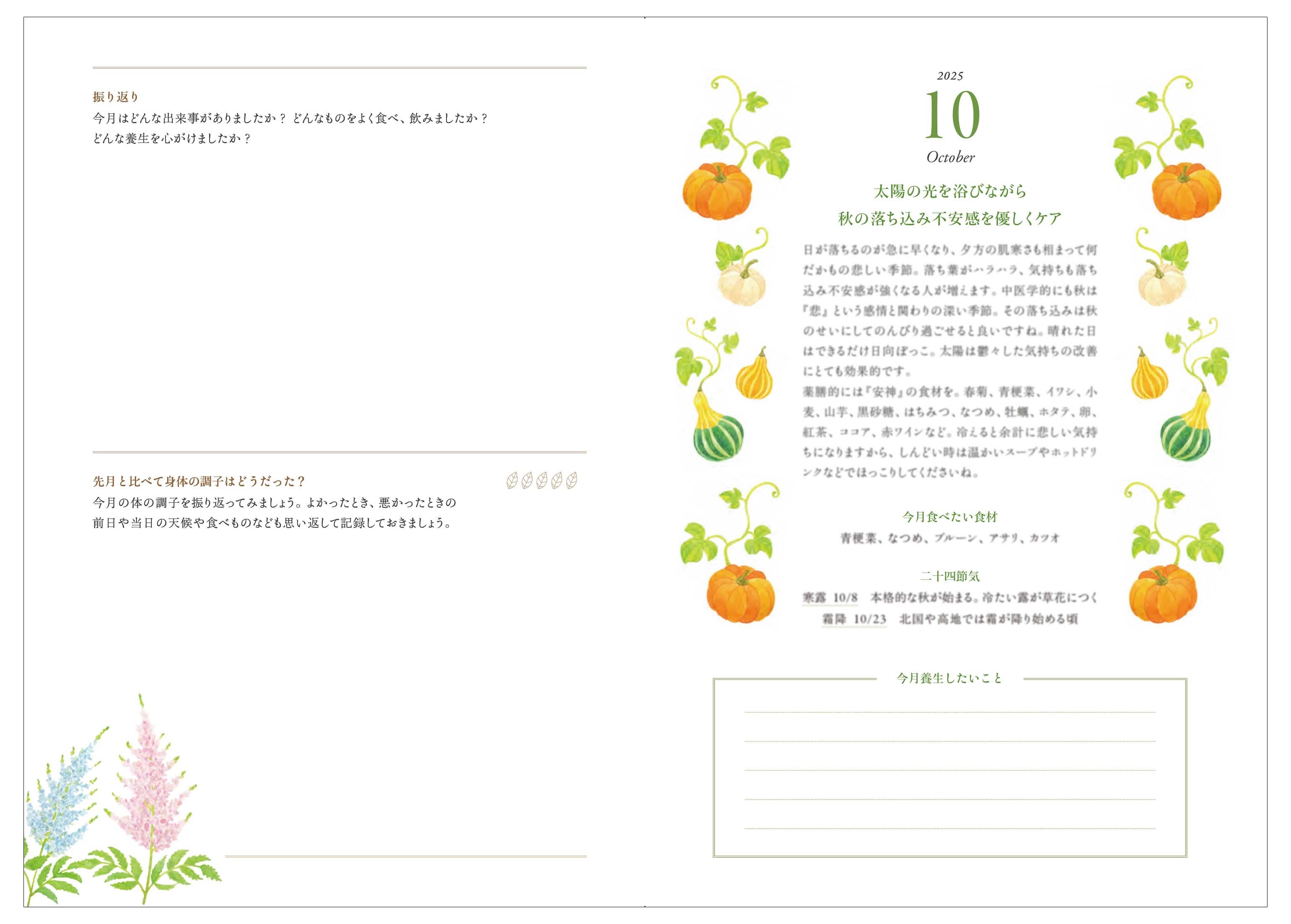 毎月の最後には振り返りページを設けているので、月ごとの心と体調の変化も把握しやすくなっています。また月扉には、その月をすこやかに過ごすためのヒントを掲載。季節を巡る植物たちのイラストが寄り添い、毎月気分よく新たなスタートが切れるようになっています。