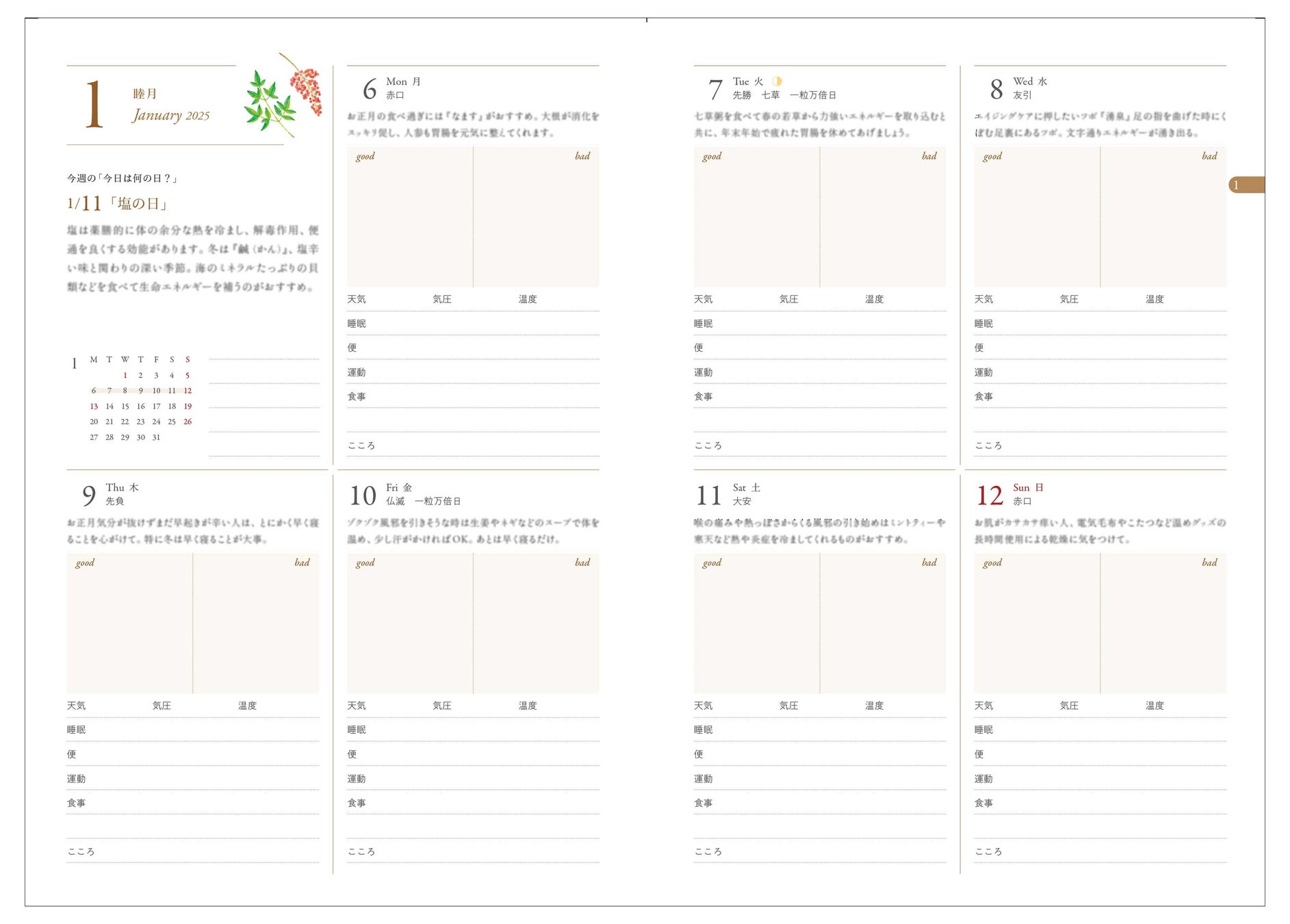 ウィークリーは、書き込みスペースが多めのブロックタイプ。冒頭には、「今日は何の日?」コラムを掲載し、語呂合わせや記念日に絡めた養生コラムも紹介しています。デイリー欄には、1日1つその時期に取り入れたい養生の知識(食またはセルフケア)を掲載。書き込みスペースには、その日の体調を「good/bad」に分けて書く欄、「天気、気圧、温度、睡眠、便、運動、食事、こころ」など項目別に記入できる欄を用意し、自分の調子が見える化できるようにしています。