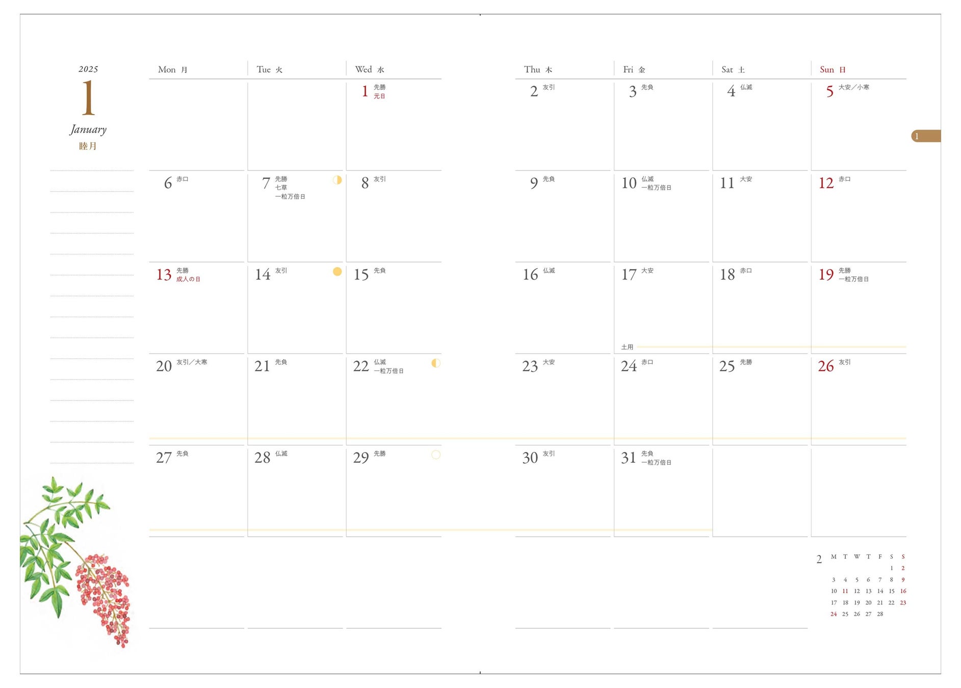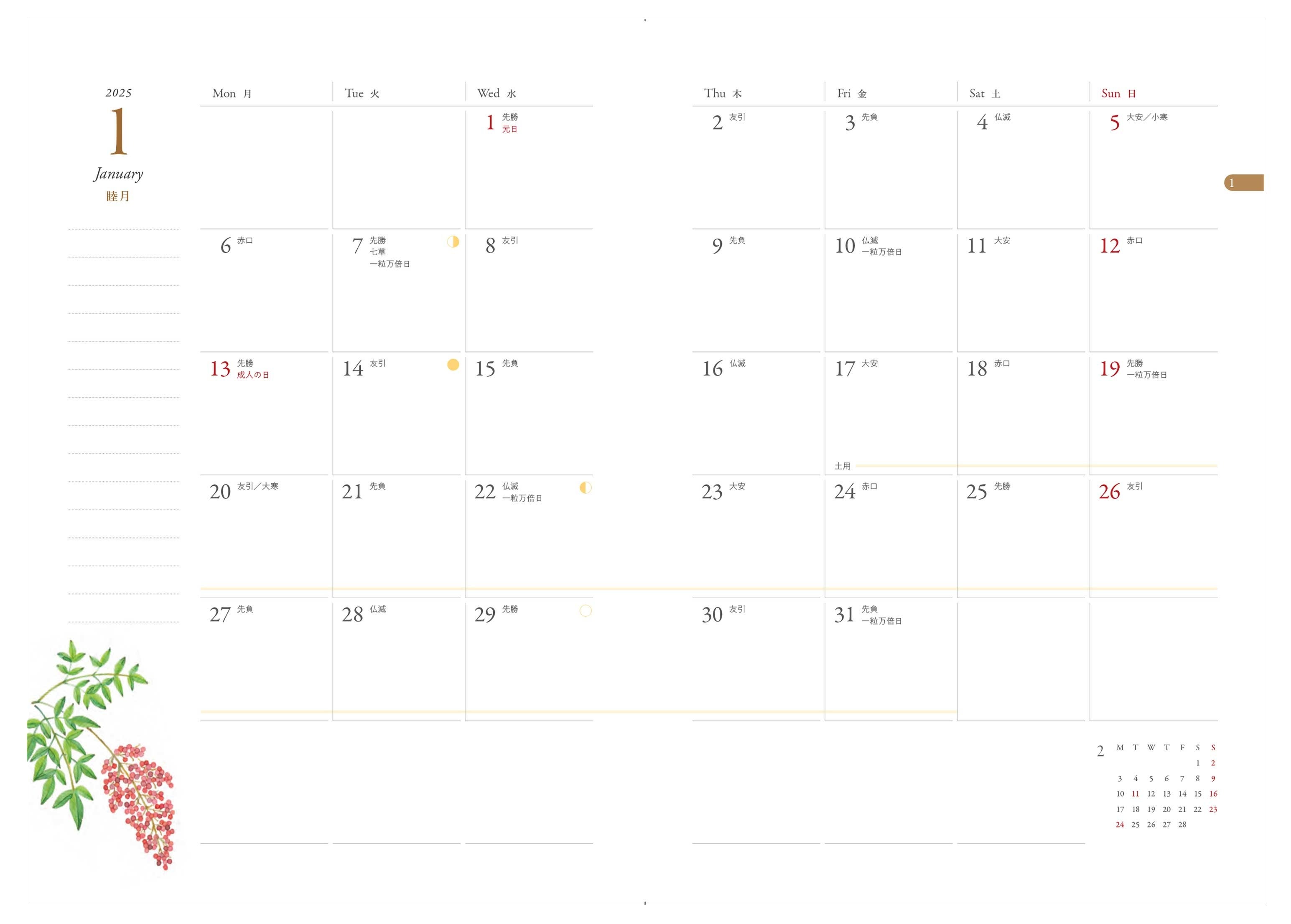 マンスリーは予定を書き込みやすいシンプルなブロックタイプで、自分の調子やリズムに合わせて予定を決めるのに便利。二十四節気・雑節や六曜、朔弦望(新月/満月、上弦/下弦)、一粒万倍日や天赦日などの吉日も掲載しています。