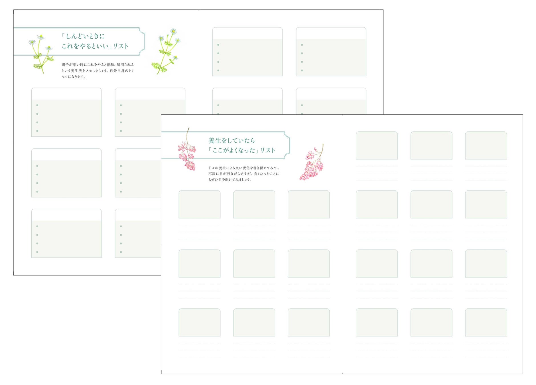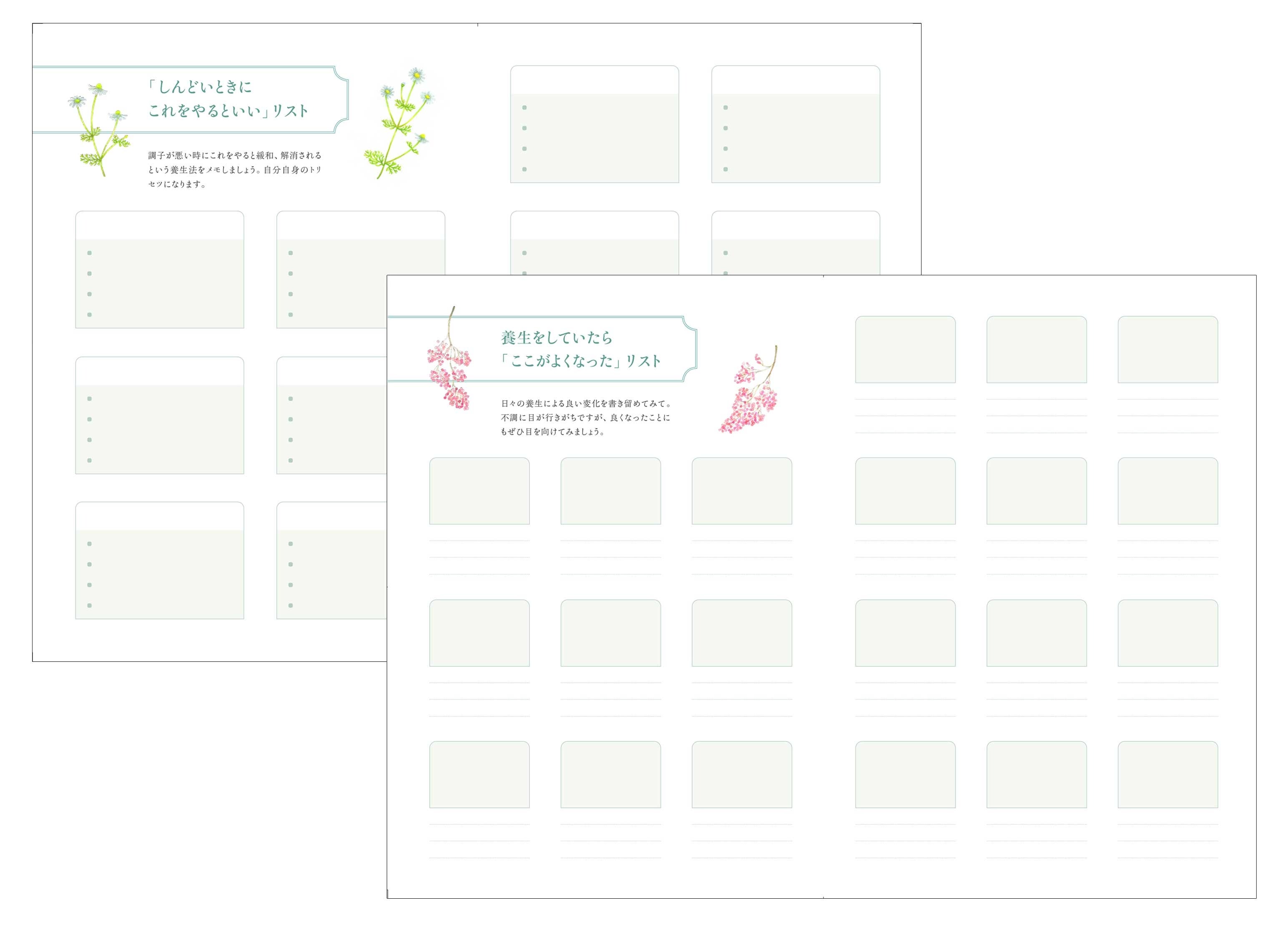 調子が悪いときにやると緩和・解消されることを書くリストや、養生をはじめてみて、実際に良くなったことを書き込んで振り返られるリストも用意。実践した養生の振り返りや、改善にも活用できます。