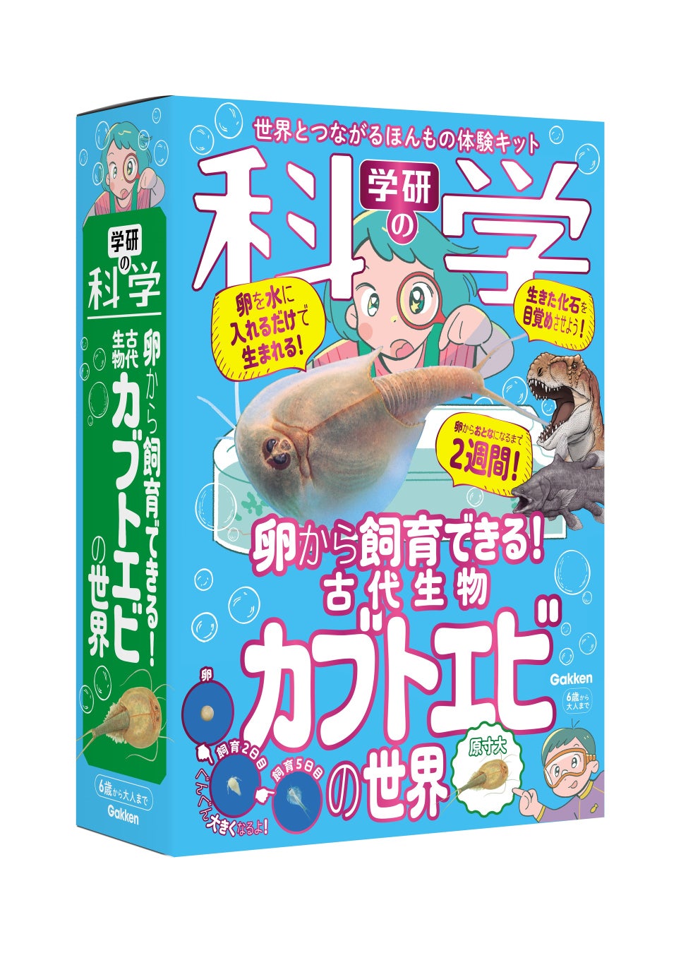 『学研の科学』で初めての生物キットです。2024年6月6日(木)発売にて予約受付中! 卵を水に入れて1~3日で、「生きた化石」といわれるカブトエビが生まれます。40個以上の乾燥卵、研究水そう、砂、えさ、クレソンの種、ルーペ、スポイト、ピンセット、さじなどがついている大満足の飼育セット。古代生物を自分で目覚めさせて、かっこいい研究水そうで飼育・観察しましょう!