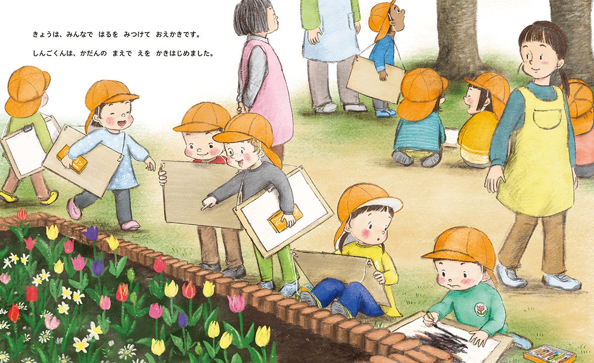 きょうはみんなで春のおえかき。しんごくんが一生懸命描いていると……「なにこれ?」「へんだよ」とお友だちに言われてしまいます。しんごくんが描いたのは、まっくろな土でした。絵の上に、涙がぽたぽたと落ちます。しんごくんが絵に込めた思いとは――。
