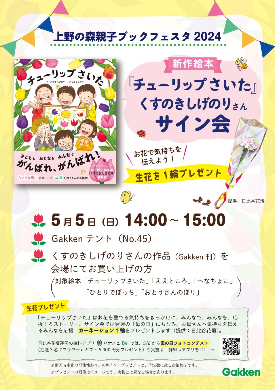 株式会社 学研ホールディングス(東京・品川/代表取締役社長:宮原博昭)のグループ会社、株式会社 Gakken(東京・品川/代表取締役社長:五郎丸徹)は、2024年4月4日(木)に人気作家くすのきしげのりさんの最新作となる絵本『チューリップさいた』を発売いたしました。発売を記念して、4月26日(金)~5月7日(火)まで「絵本カフェ ムッチーズカフェ」にて展覧会を開催中! また、GW中の5月5日(日)には「サイン会」も開催いたします。
