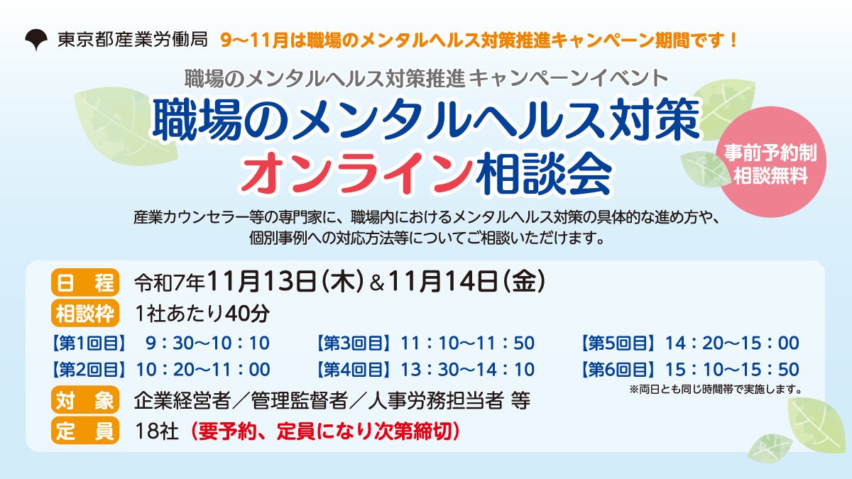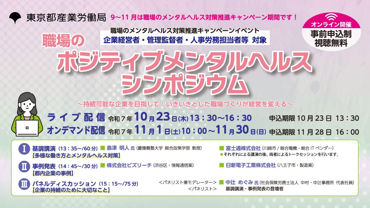 キャンペーン期間中には、都が職場のメンタルヘルス対策に関するシンポジウムと相談会を オンラインで 実施します。
